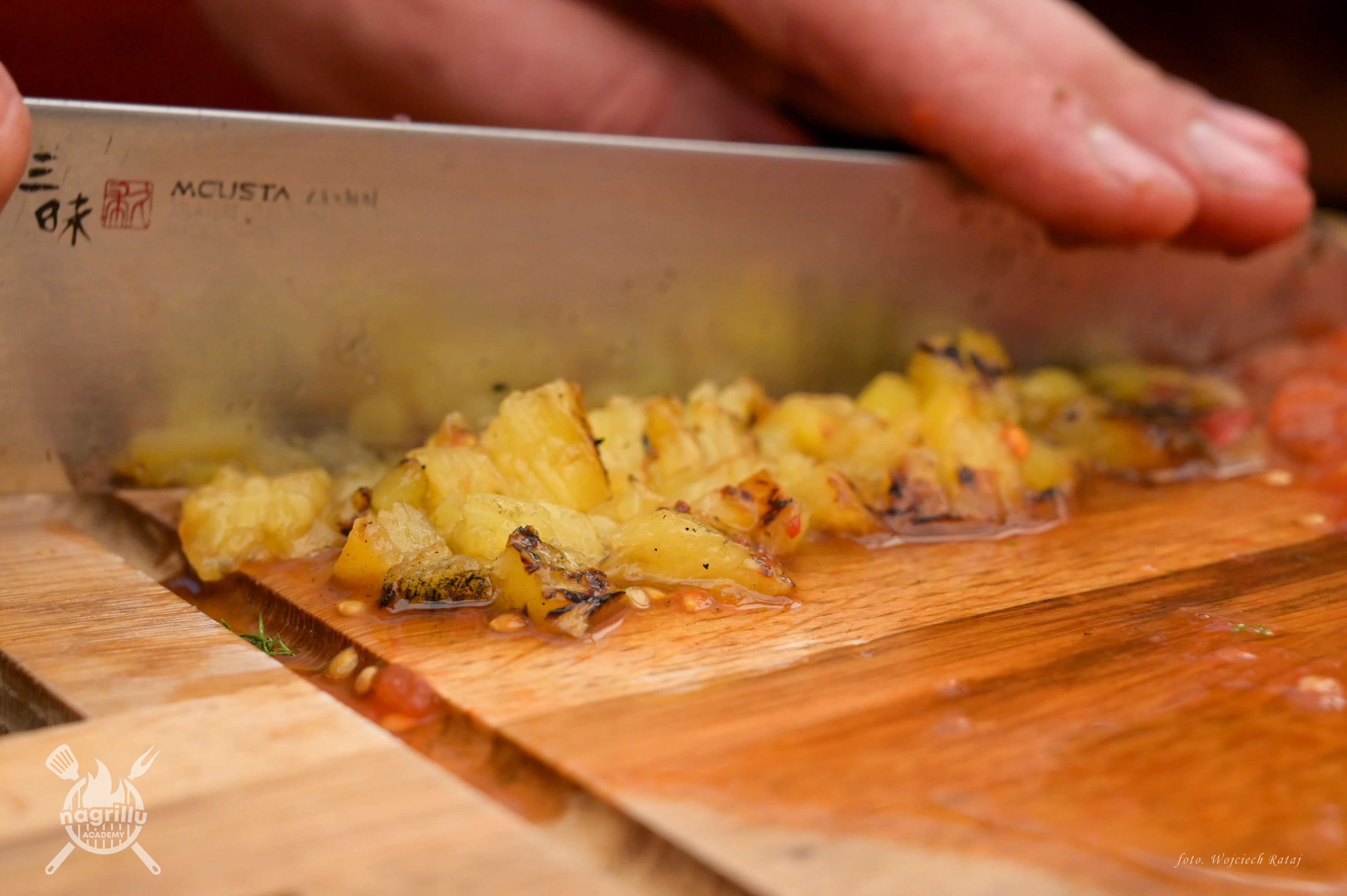 3. Pomidory przekrój na pół, zgrilluj, a potem również posiekaj w drobną kostkę.