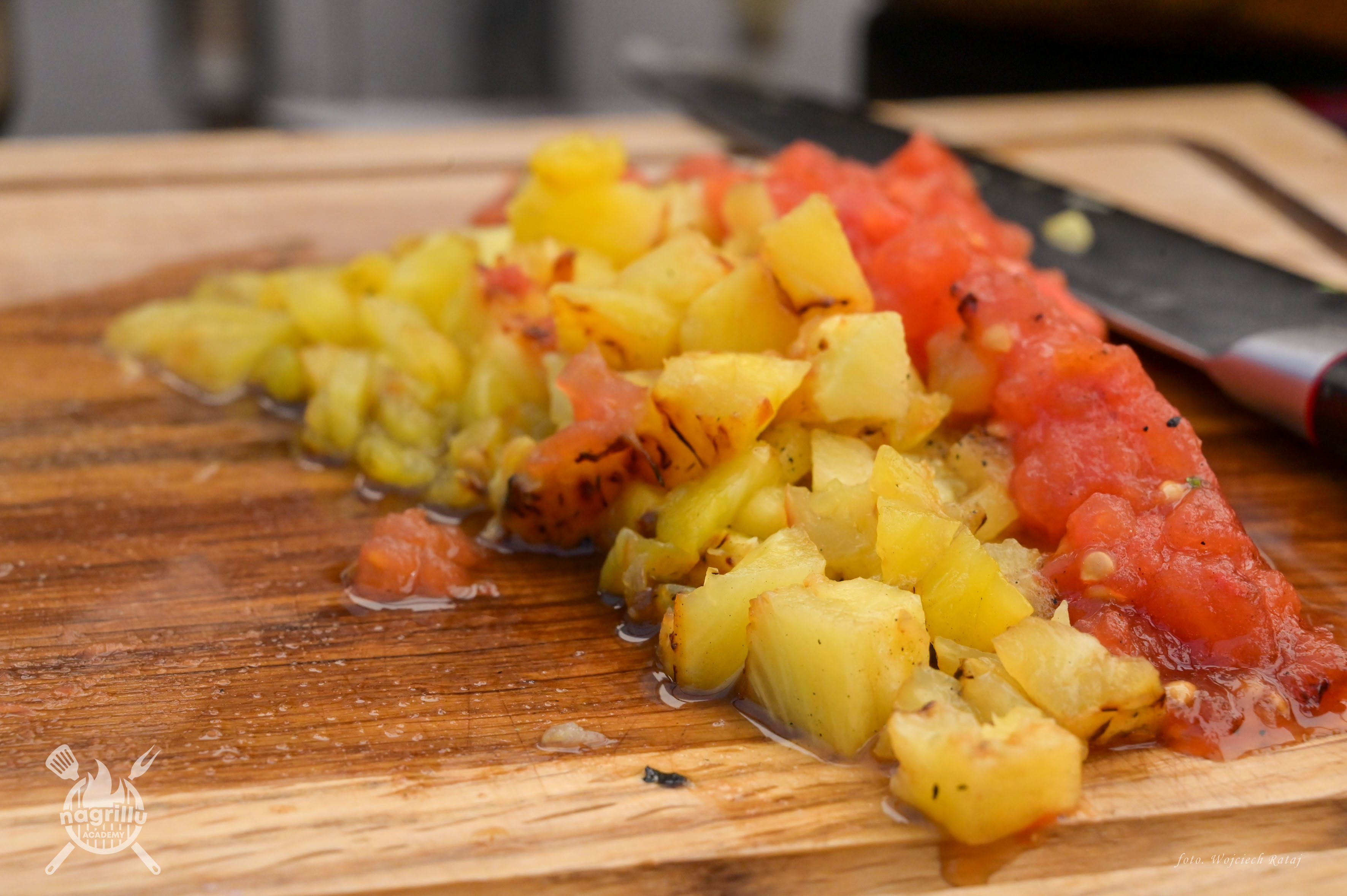 Ta salsa to idealne połączenie słodyczy grillowanego ananasa, soczystych pomidorów i pikantnego chili. Dzięki dodatkowi świeżej kolendry, imbiru i limonki zyskuje egzotyczny charakter, a ketchup i miód nadają jej wyjątkowej głębi smaku. Świetnie sprawdzi się jako dodatek do grillowanych mięs, ryb, taco czy nachosów.